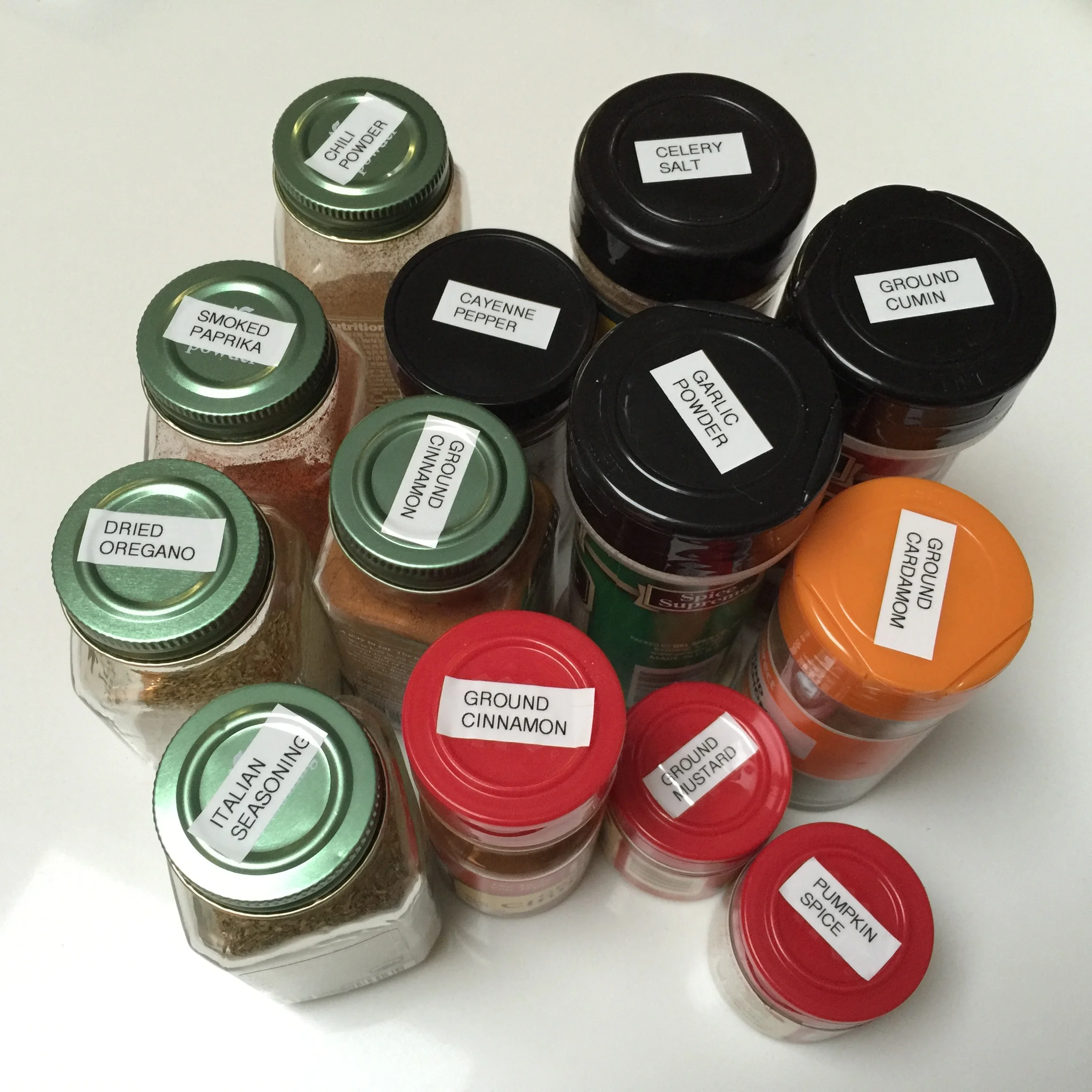 In my defense, I have all my spices stored in a drawer standing straight up so I can't easily see the sides and it was getting really annoying to pull out 5 jars every.single.time. before finding the one I was looking for. So, I did something about it.